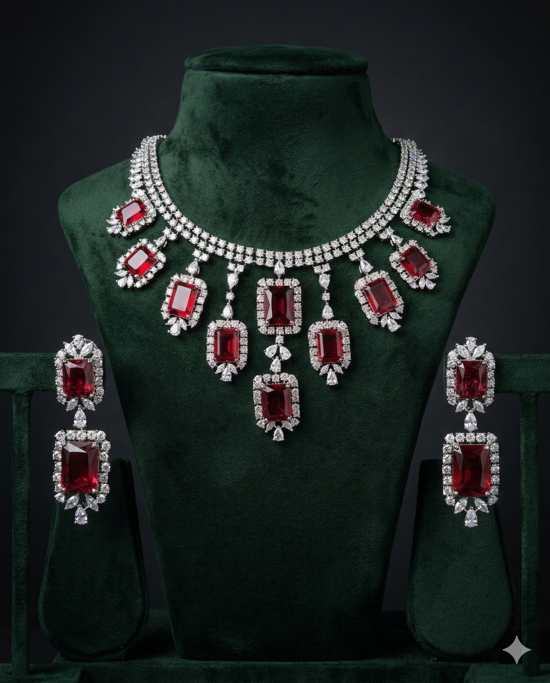 Elevate your evening look with this stunning Crimson Gala Necklace Set, featuring radiant ruby stones and sparkling zirconia crafted in mixed metals with rhodium plating. This bold, luxurious ensemble combines a striking necklace with matching earrings, designed to make a statement at any special occasion. The rich crimson hues paired with brilliant sparkle create an eye-catching contrast that complements both traditional and contemporary styles. Perfect for weddings, celebrations, or whenever you want to shine with confidence and elegance.