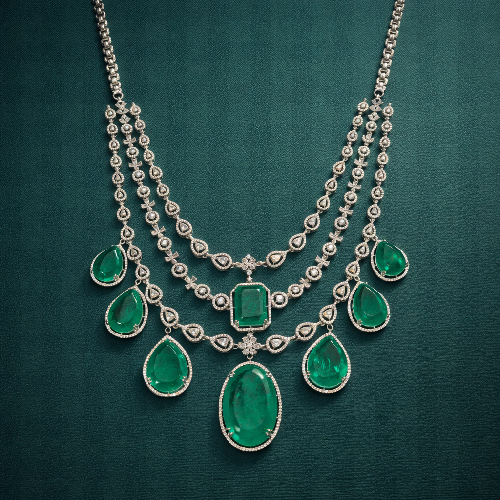 Elevate your jewellery collection with this sophisticated necklace and earring set, featuring stunning emerald-like cubic zirconia stones that capture light with brilliant sparkle. The mixed metal design seamlessly blends warm and cool tones, while the pristine white polish adds a refined, contemporary edge. Perfect for both everyday elegance and special occasions, this versatile set delivers luxury appeal at an accessible price point.