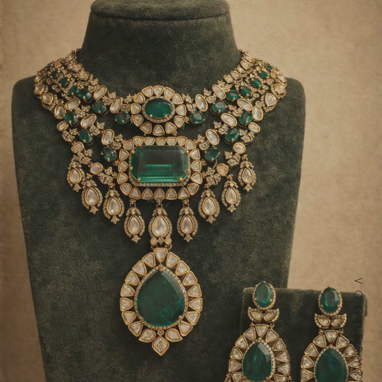 Elevate your collection with this exquisite Emerald Grandeur Necklace Set, featuring lustrous emerald-like stones set in a sophisticated mixed metal framework. Each piece showcases authentic polki faux craftsmanship with an antique polish finish that exudes timeless elegance. The coordinated necklace and earring ensemble combines traditional artistry with contemporary design, creating a versatile statement suitable for both festive occasions and refined everyday wear. The vintage-inspired patina enhances the jewels' depth and character, while the mixed metal composition adds visual intrigue and styling flexibility. A masterpiece for those who appreciate heritage jewelry with enduring appeal.
