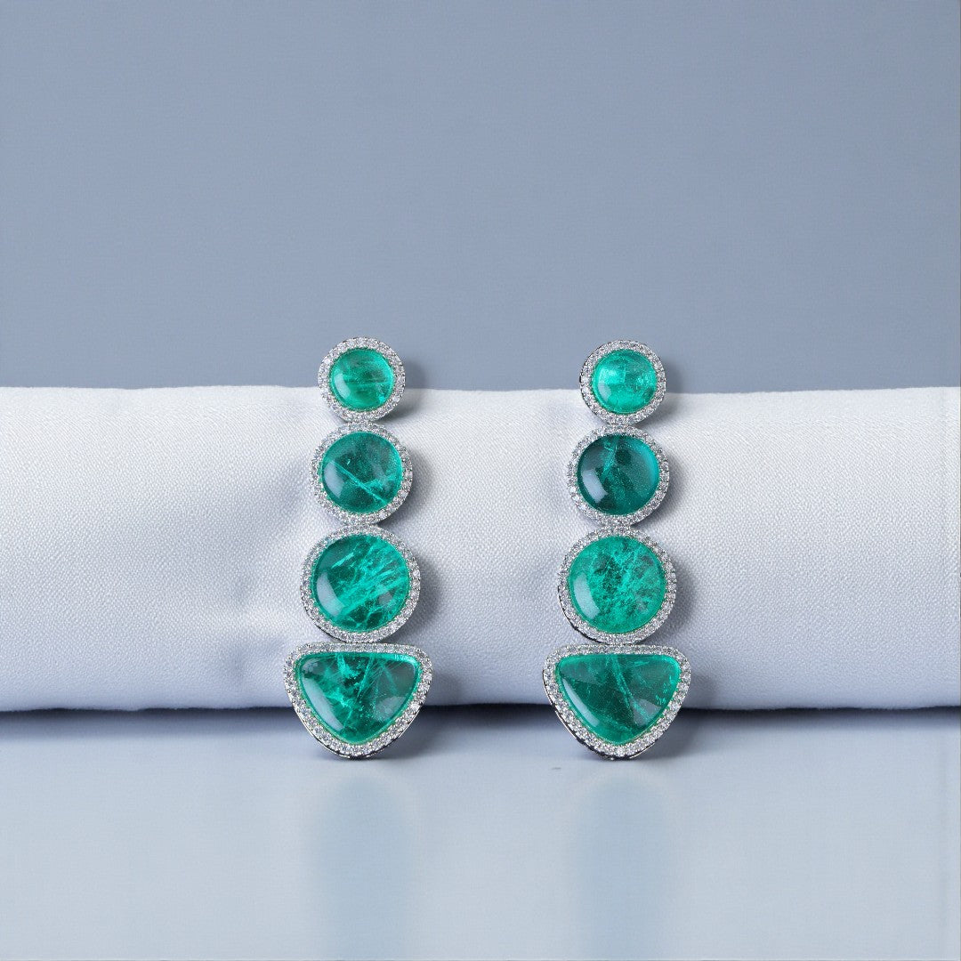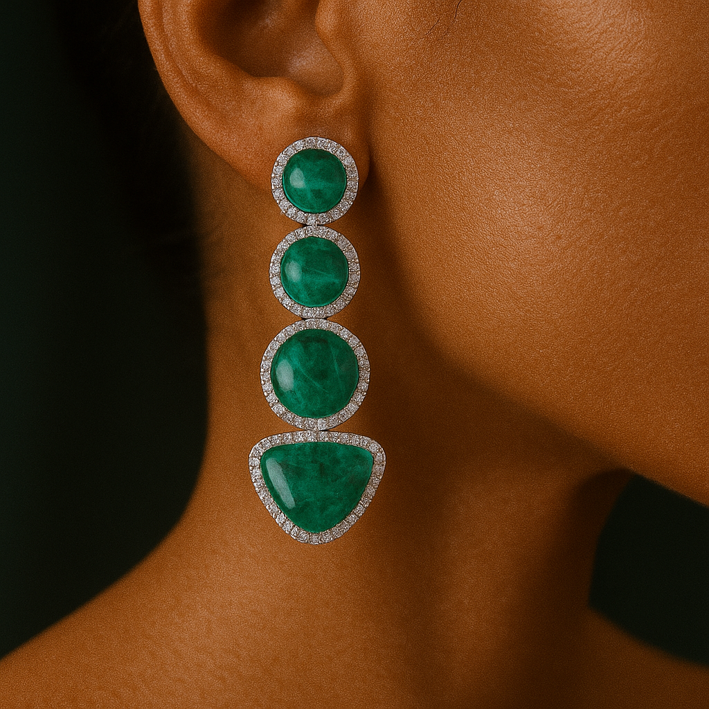 Jade Royale Drops showcase the timeless elegance of emerald semi-precious stones, delicately framed with sparkling cubic zirconia outlines. These elongated earrings combine natural beauty with refined glamour, perfect for elevating both everyday sophistication and special occasions. The verdant hues of emerald paired with brilliant zirconia accents create a striking contrast that catches light beautifully. An ideal choice for those seeking jewelry that balances understated luxury with distinctive style.