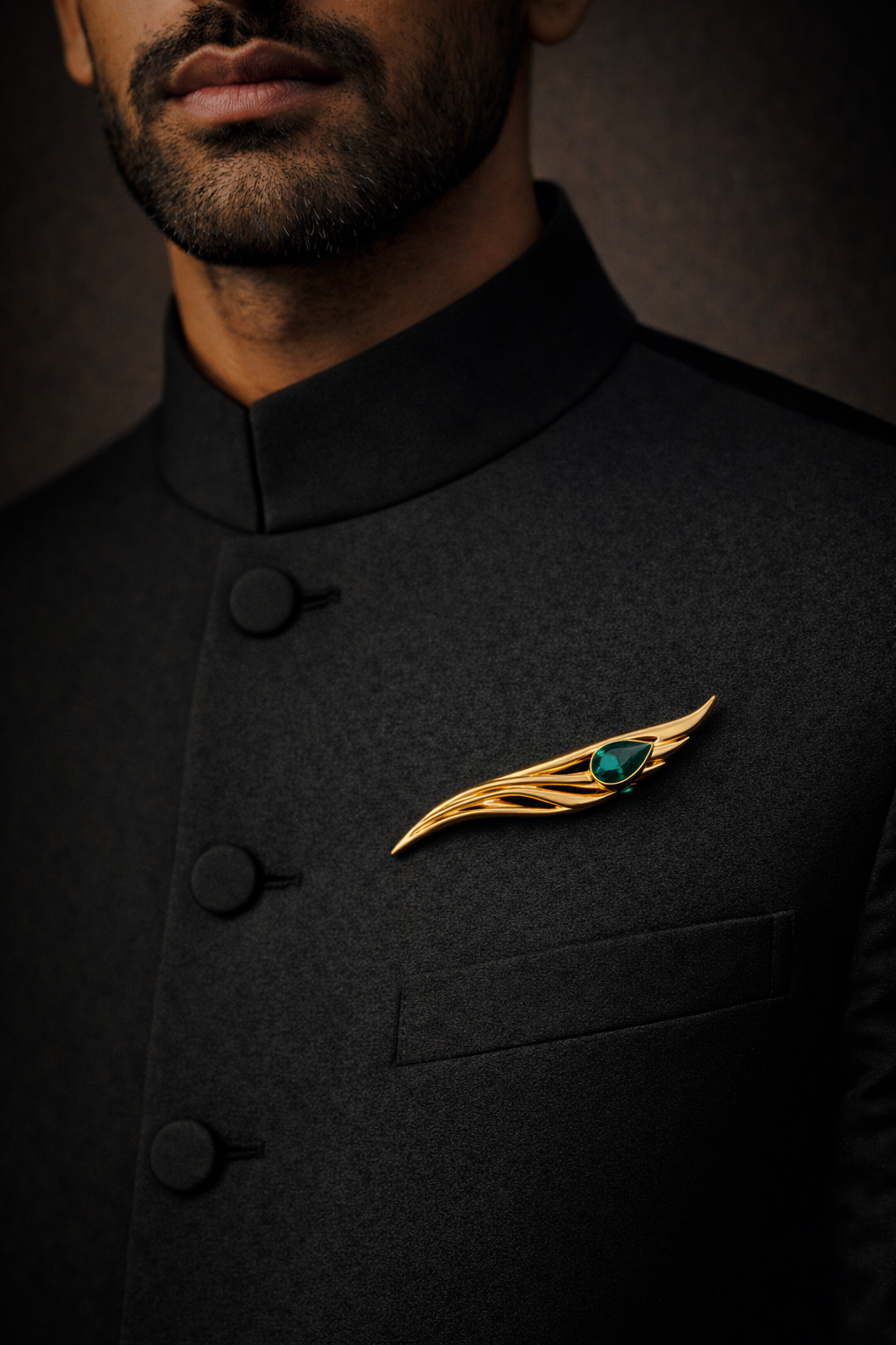 Elevate your accessory collection with this sophisticated Luxe Leaf Brooch, featuring a verdant green stone set in lustrous golden polish. The silver-based pin mechanism ensures secure, comfortable wear on jackets, scarves, or evening wear. This refined piece combines timeless elegance with contemporary design, making it an ideal accent for both formal occasions and elevated everyday styling. The harmonious blend of warm gold tones and cool silver creates a versatile statement that complements any wardrobe.