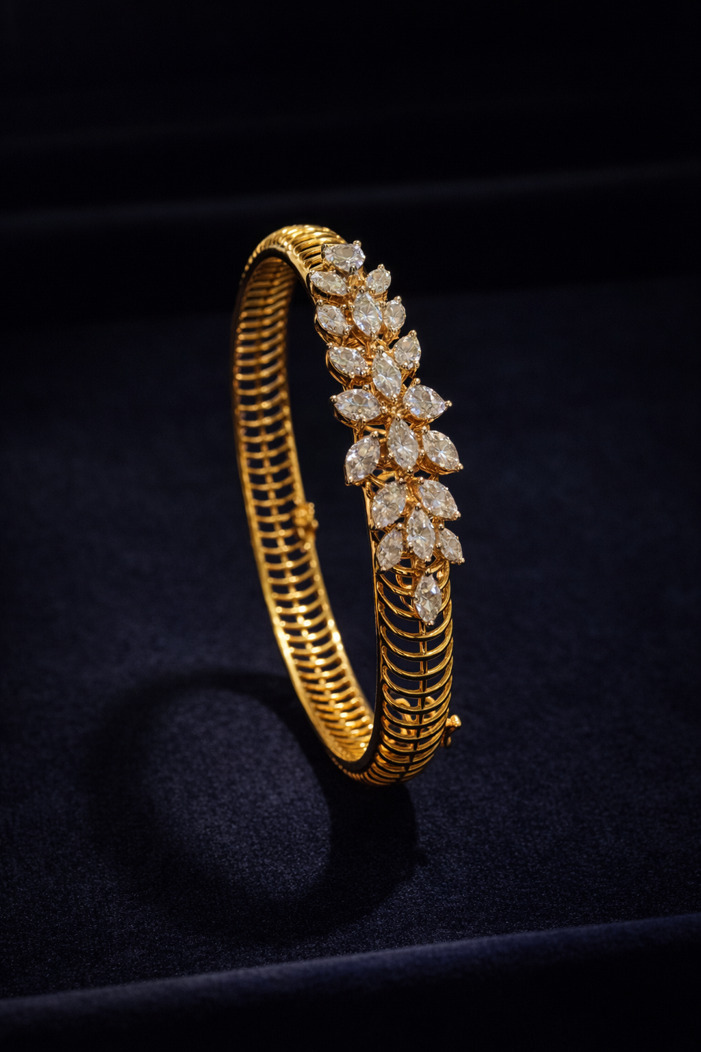 Crafted from pure silver with an exquisite golden polish finish, this elegant bracelet features stunning cubic zirconia stones that catch light beautifully. The delicate floral bloom design brings sophistication to any occasion, whether casual or formal. Fully customizable sizing ensures a perfect fit for your wrist. A timeless piece that combines lustrous craftsmanship with refined aesthetics, ideal for those who appreciate quality jewelry with understated elegance.