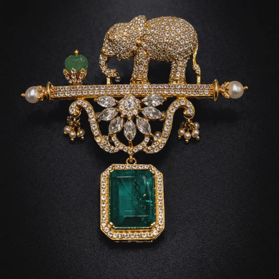 Crafted from pure silver, this regal elephant brooch commands attention with its striking design. Adorned with brilliant zirconia and lush green emeralds, it delivers sophisticated glamour for the discerning gentleman. The secure pin system ensures reliable wear, whether anchoring a lapel or adorning formal attire. A bold statement piece that elevates any ensemble with timeless elegance and refined craftsmanship.
