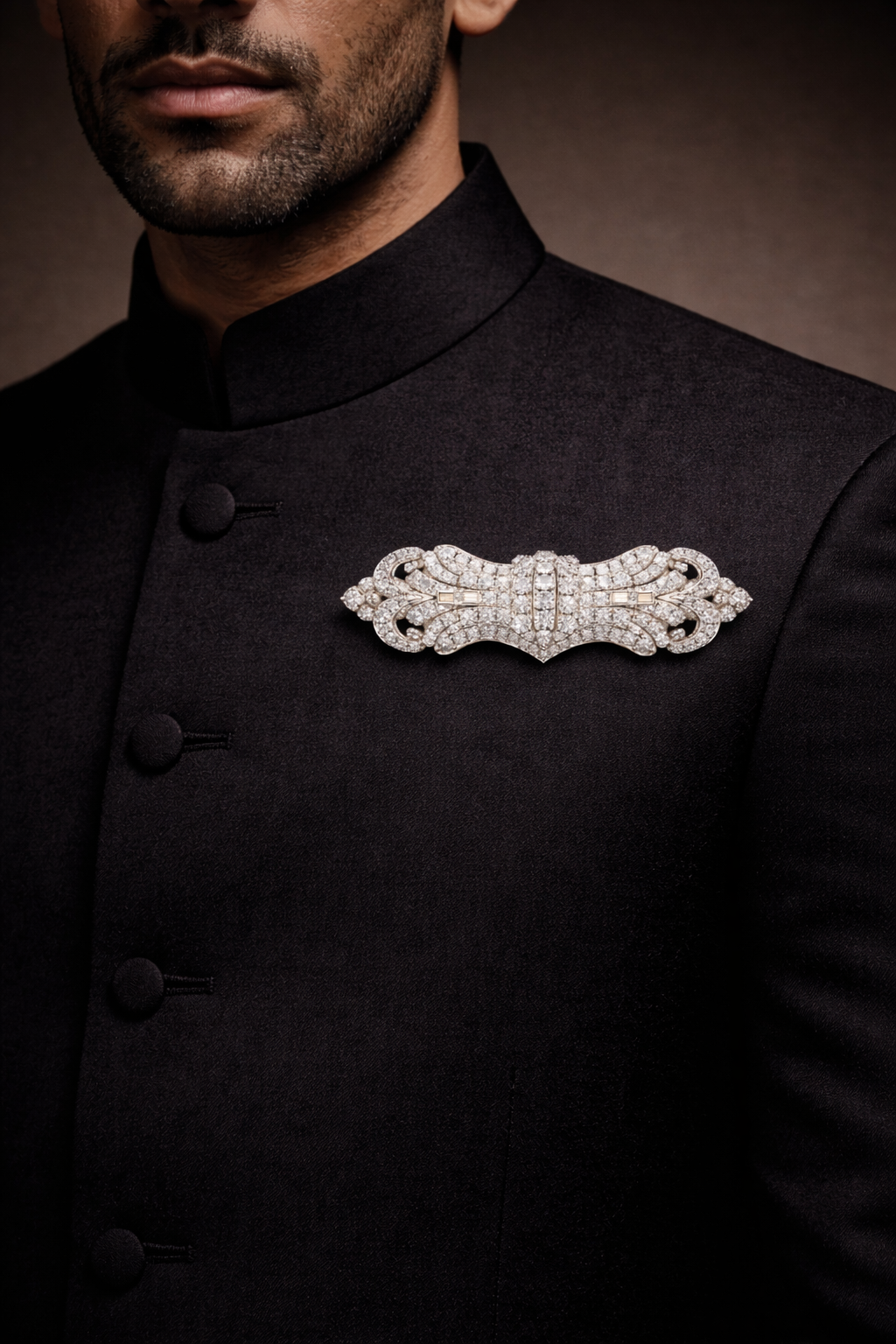Elevate your formal wardrobe with this exquisite Pure Silver Royal Court Brooch, meticulously crafted for the discerning gentleman. Fashioned from premium pure silver and adorned with brilliant cubic zirconia stones, this piece delivers a regal aesthetic with remarkable sparkle. The expert silver polish creates a lustrous finish that catches light beautifully, ensuring you command attention at any occasion. Whether worn on a blazer, waistcoat, or traditional attire, this brooch embodies timeless sophistication and refined elegance. A statement accessory that transforms any ensemble into something truly distinguished.