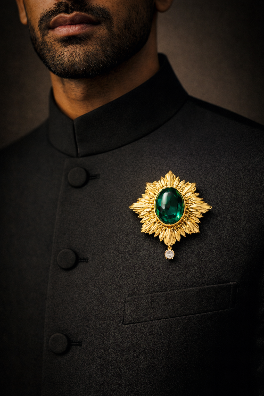Elevate your formal wear with this distinguished brooch, meticulously crafted from pure silver and adorned with a striking emerald stone. The verdant gem captures light beautifully, adding sophistication to any ensemble. Its golden accents provide a refined contrast, creating a timeless piece that speaks to refined taste. Ideal for the discerning gentleman who values quality craftsmanship and understated elegance. A versatile accessory that transitions seamlessly from boardroom to evening occasions.