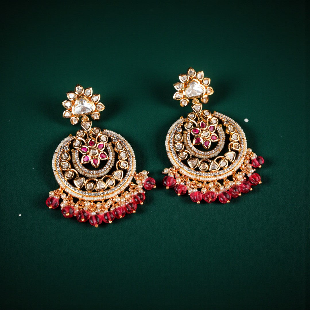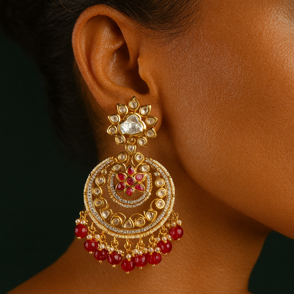 Elevate your ethnic ensemble with these exquisite Ruby Radiant Balis, where timeless craftsmanship meets contemporary design. Meticulously crafted from mixed metals, these designer balis feature lustrous ruby stones that catch light with every movement. The intricate detailing showcases traditional artistry while the refined aesthetic appeals to the modern woman. Perfect for festive occasions or adding a touch of opulence to everyday wear, these balis are a statement piece that celebrates your refined taste and cultural elegance.